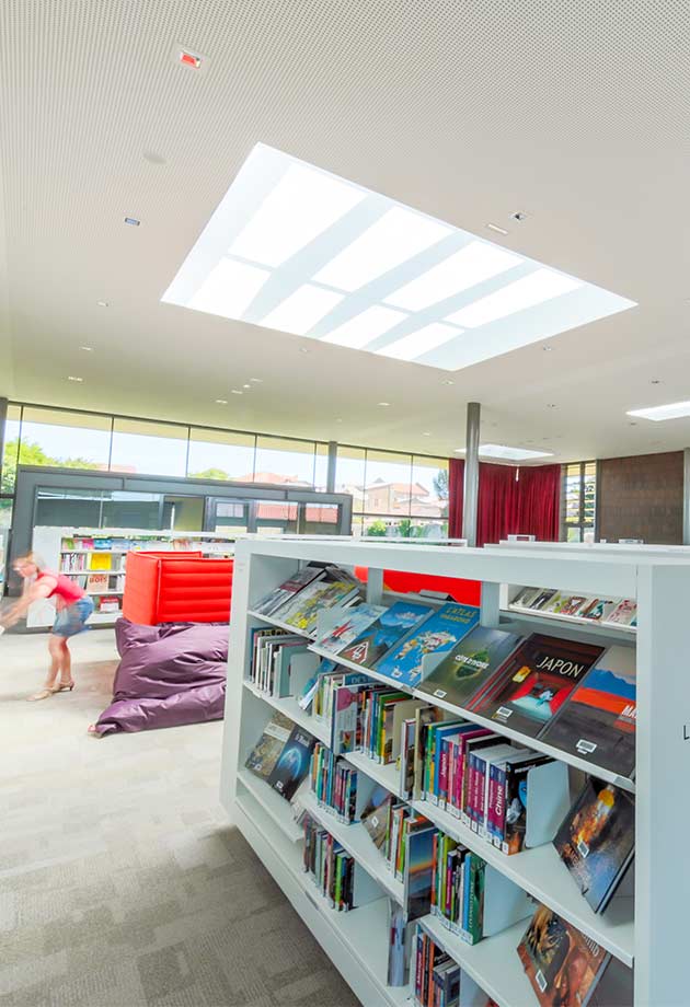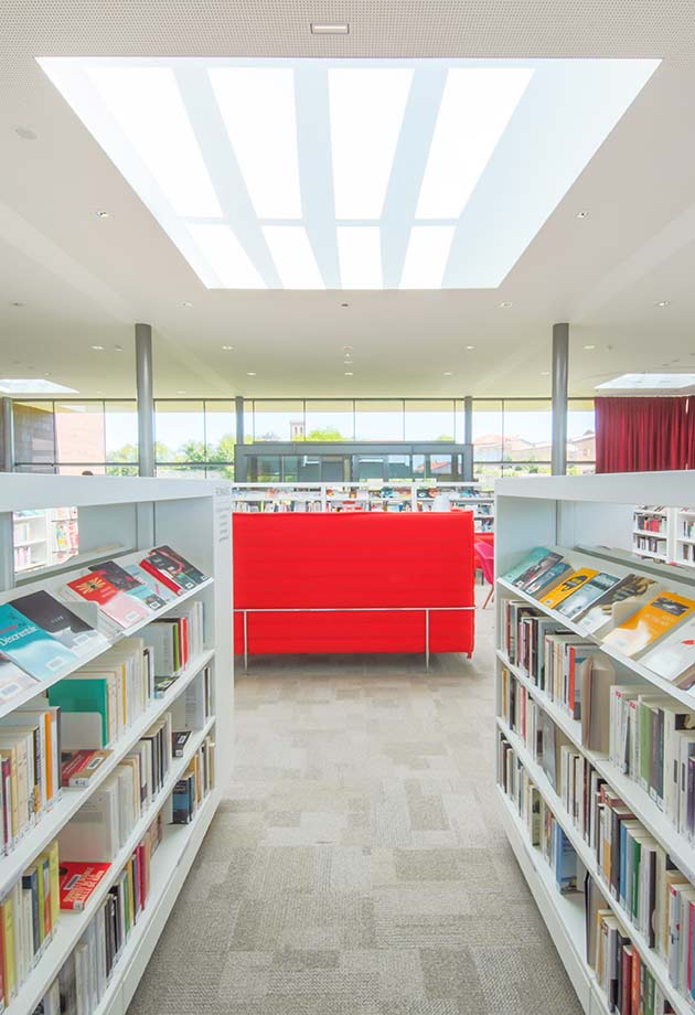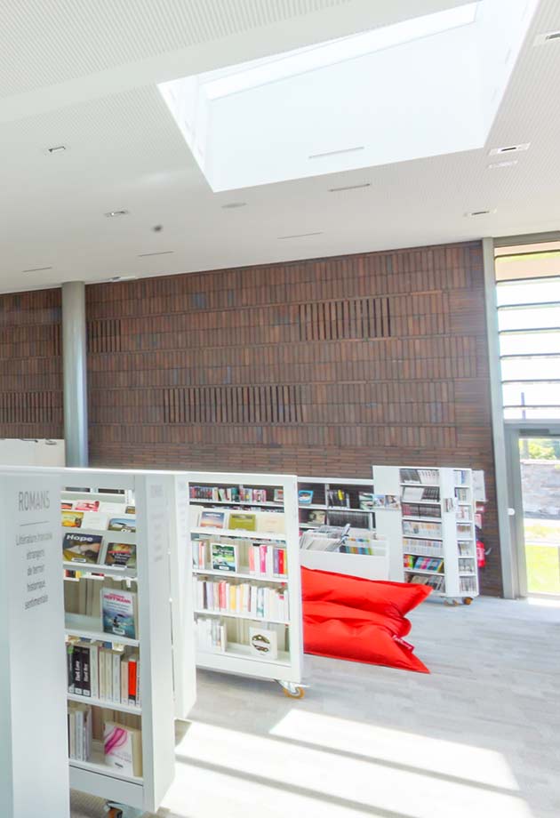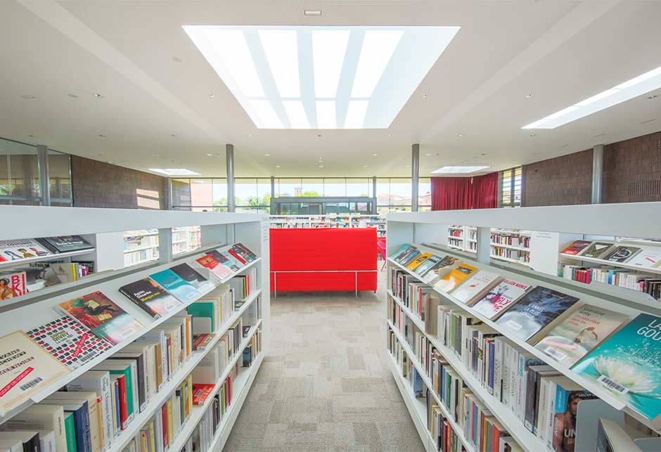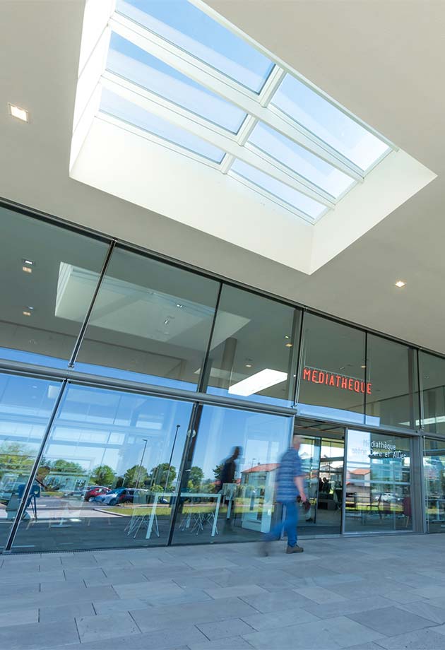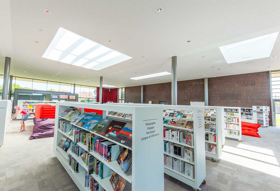 Au total, 11 verrières modulaires VELUX ont été installées au-dessus des différents espaces de la Médiathèque, afin de multiplier les points d’entrée de lumière, ainsi que des modules ouvrants de désenfumage permettant d’assurer la sécurité des usagers en cas d’incendie.